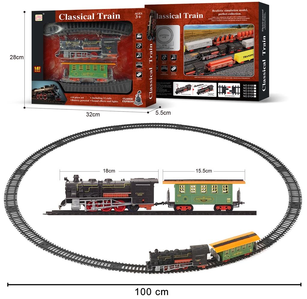 Pociąg-kolejka na baterie w zestawie z torami do złożenia w kształt owalu o szerokości ponad 100cm.