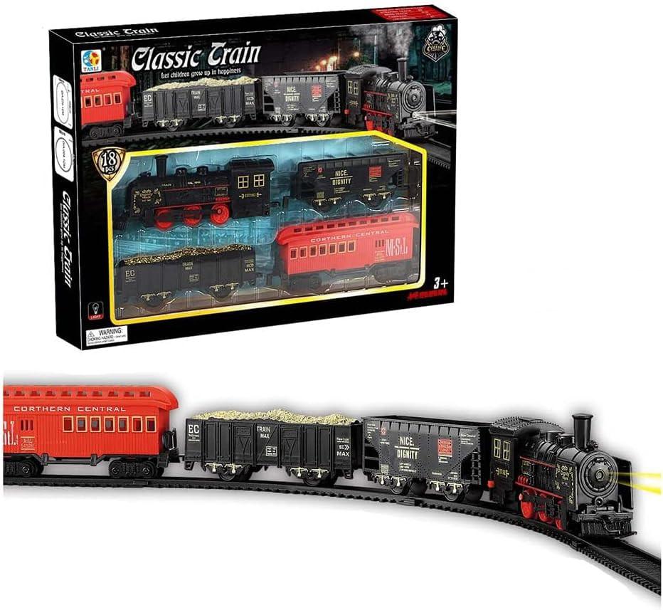 Pociąg-kolejka na baterie w zestawie z torami do złożenia w kształt koła o średnicy 68cm lub owalu o wymiarach 68cm x 108cm.