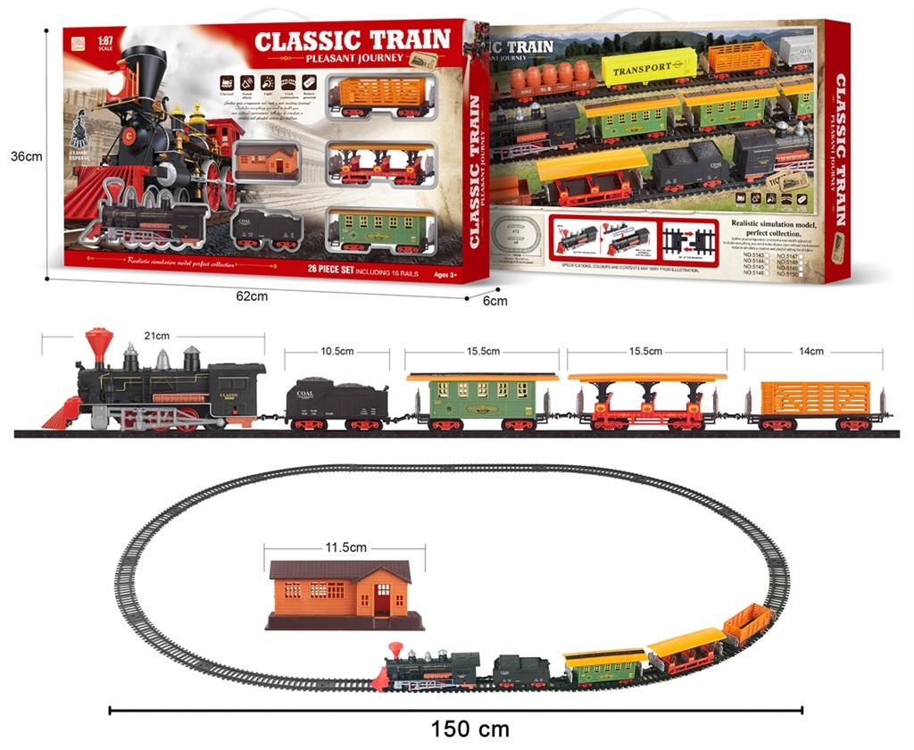 Pociąg-kolejka na baterie w zestawie z torami do złożenia w kształt owalu o szerokości ponad 150cm.