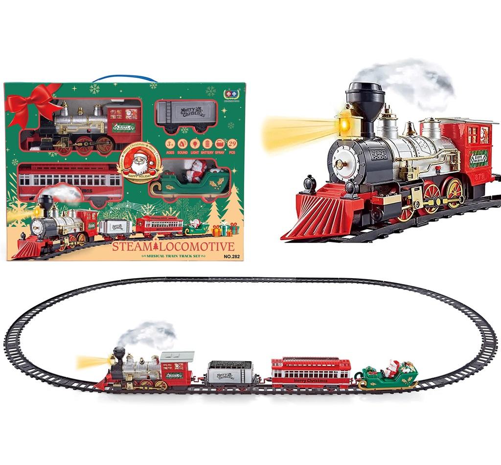Pociąg-kolejka na baterie z saniami Mikołaja, w zestawie z torami do złożenia w kształt owalu. Ogromną zaletą jest świąteczne opakowanie.