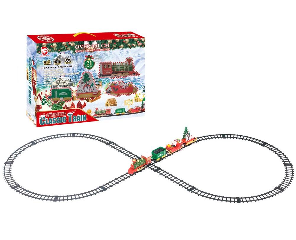 Pociąg-kolejka na baterie z saniami Mikołaja, w zestawie z torami do złożenia w kształt ósemki. Ogromną zaletą jest świąteczne opakowanie.
