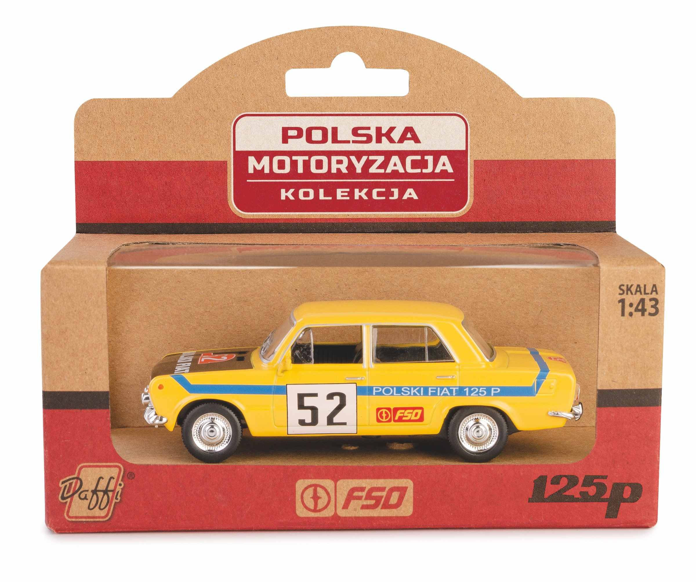 FIAT 125P RALLY 1:43 ŻÓŁTY "Polski Fiat 125p – samochód osobowy klasy średniej produkowany w Polsce w FSO w Warszawie od 1967 do 1991 roku na podstawie licencji włoskiej firmy FIAT. Po wygaśnięciu licencji w 1983 roku nazwę zmieniono na FSO 125p. Spotykane są też oznaczenia FSO 1300/1500. Potocznie nazywany Dużym Fiatem. Był połączeniem włoskich modeli Fiat 125 i starszego 1300/1500. Samochód dostępny był początkowo jako 4-drzwiowy sedan, w 1972 roku dołączyła wersja kombi, trzy lata później pick-up. Przygotowano dwie limitowane serie 125p: 1600 Monte Carlo i 1800 Akropolis. Zastosowano w nich silniki pozwalające na osiągnięcie prędkości rzędu 170 km/h. Licencja FSO Model metalowy DIE CAST METAL z elementami plastikowymi Produkt zgodny z Europejską normą dotyczącą bezpieczeństwa zabawek. Marka: Daffi Produkt niezalecany dla dzieci poniżej 3 lat. Seria: KOLEKCJA POLSKIEJ MOTORYZACJI