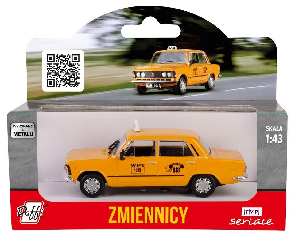 POLSKI FIAT 125P “ZMIENNICY” Kiedy 18 października 1987 roku debiutował pierwszy odcinek serialu „Zmiennicy”, nikt nie przypuszczał, że najbardziej rozpoznawalnym elementem serialu zostanie taksówka Fiat 125p w kolorze żółtym „bahama yellow”, o numerze bocznym WPT 1313. Pojazd należał do Warszawskiego Przedsiębiorstwa Taksówkowego. Został przekazany do WPT jako jeden z jedenastu wybrakowanych egzemplarzy, które początkowo przeznaczone były na eksport do Belgii. Był użytkowany przez tytułowych „Zmienników” – Kasię vel Mariana – w tej roli Ewa Błaszczyk, oraz Jacka, w którego postać wcielił się Mieczysław Hryniewicz. Fiat 125p posiadał tablice rejestracyjne o numerze WAE 606B i był napędzany przez silnik o pojemności 1500 ccm. W rzeczywistości na planie ?lmowym ekipa posiadała trzy samochody, które wcielały się w żółtą „1313”. Drobne różnice między nimi widać na niektórych ujęciach w serialu. Nie jest znana dokładna data produkcji samochodu. Mówi się o 1979 lub 1980 roku. Losy taksówki po zakończonych zdjęciach do serialu nie są znane. Teorie mówią o jej zezłomowaniu, przekazaniu prywatnemu kolekcjonerowi lub… dalszej eksploatacji jako taxi. Serial w reżyserii Stanisława Barei emitowany był na antenie Telewizji Polskiej od 18 października 1987 roku do 12 lutego 1988 roku. Składał się z serii 15 odcinków. Serial przedstawiał w krzywym zwierciadle absurdy PRL-u. Bohaterami są Kasia vel Marian oraz Jacek, warszawscy taksówkarze. Wszystkie wątki produkcji splatają się wokół taksówki o numerze bocznym 1313. W produkcji udział wzięli między innymi: Ewa Błaszczyk, Mieczysław Hryniewicz, Piotr Pręgowski, Kazimierz Kaczor, Irena Kwiatkowska, Krzysztof Kowalewski oraz Bronisław Pawlik. Premiery serialu nie doczekał wybitny reżyser, Stanisław Bareja, który zmarł w czerwcu 1987 roku. Licencja FSO Model metalowy z elementami plastikowymi. Produkt niezalecany dla dzieci poniżej 3 lat.