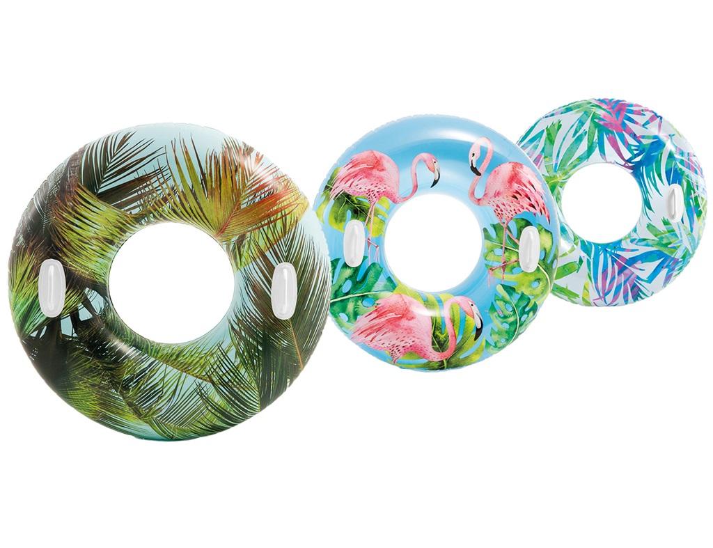 Duże koło do pływania z uchwytami w kolorowe, tropikalne wzory.