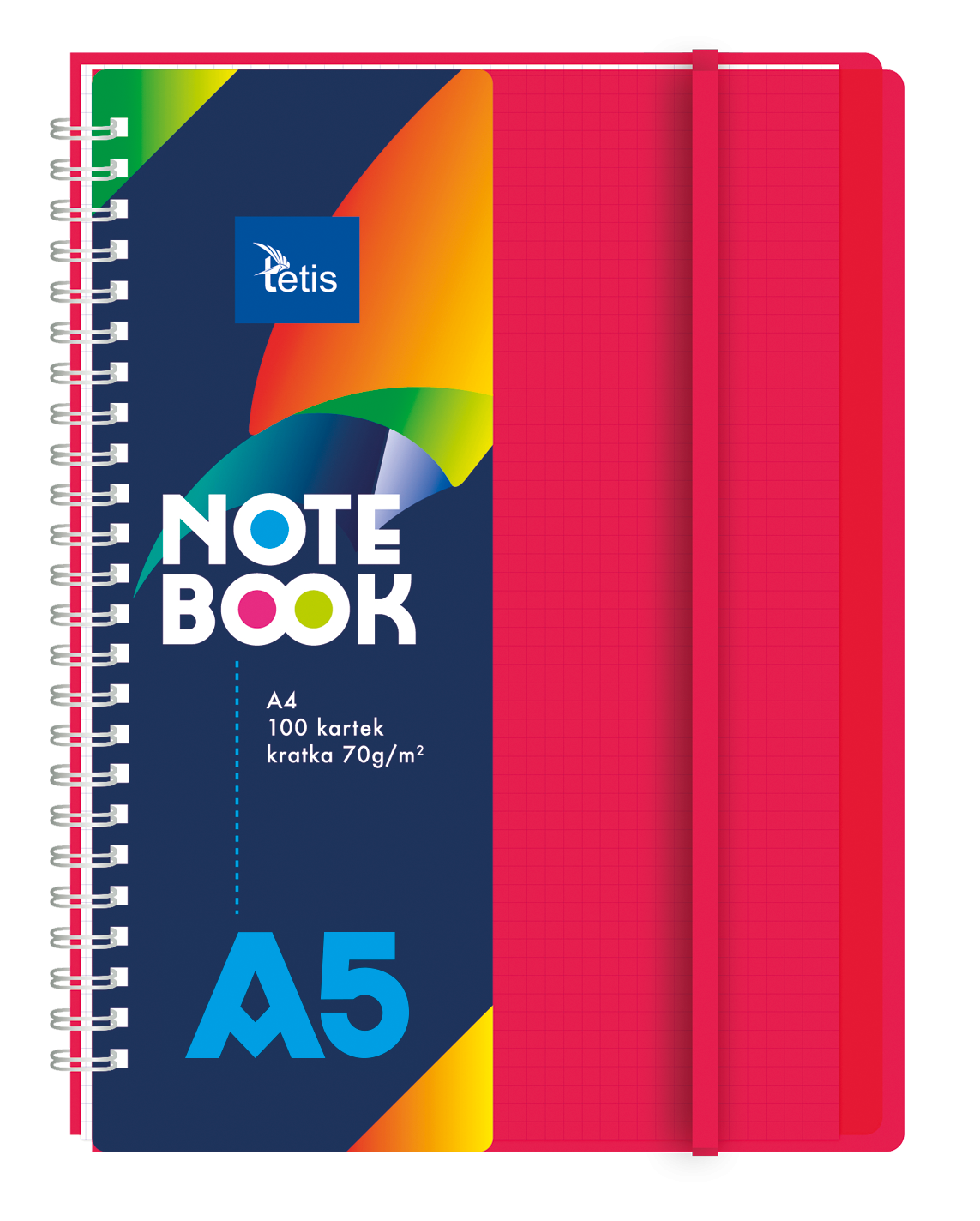 Kołonotatnik w oprawie PP. Posiada plastikowe transparentne przekładki (5 sztuk) i gumkę dopasowaną do koloru okładki. Gramatura papieru: 70 g/m2