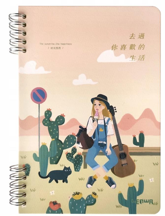 Kołonotes A5 w twardej oprawie z kolorowym rysunkiem przedstawiającym siedzącą na ławce długowłosą dziewczynę w kapeluszu z plecakiem i gitarą. Posiada 80 kartek w linie o gramaturze 70 gsm.