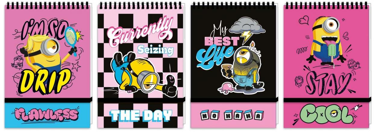 Fascynujący design - Okładka każdego notatnika ozdobiona jest modną grafiką z serii Minionki co nadaje mu unikalnego charakteru. Miękka oprawa z uszlachetnieniem - lakier matowy zapewni trwałość i odporność na zniszczenia. Czarna spirala dodaje notatnikom eleganckiego wykończenia.