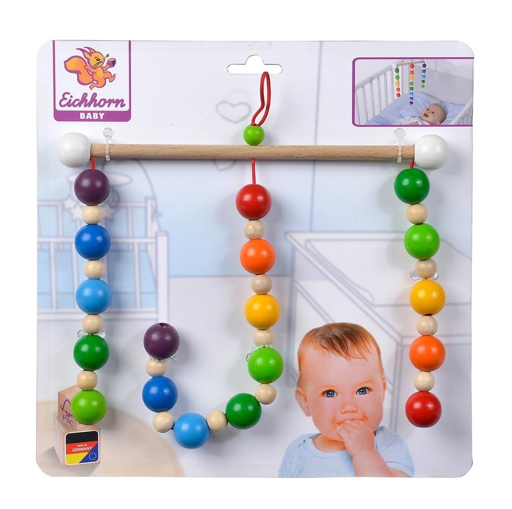 Kolorowa karuzela dla niemowląt. Dziecko może śledzić wzrokiem kolorowe kulki i jest zachęcane do ich chwytania.
