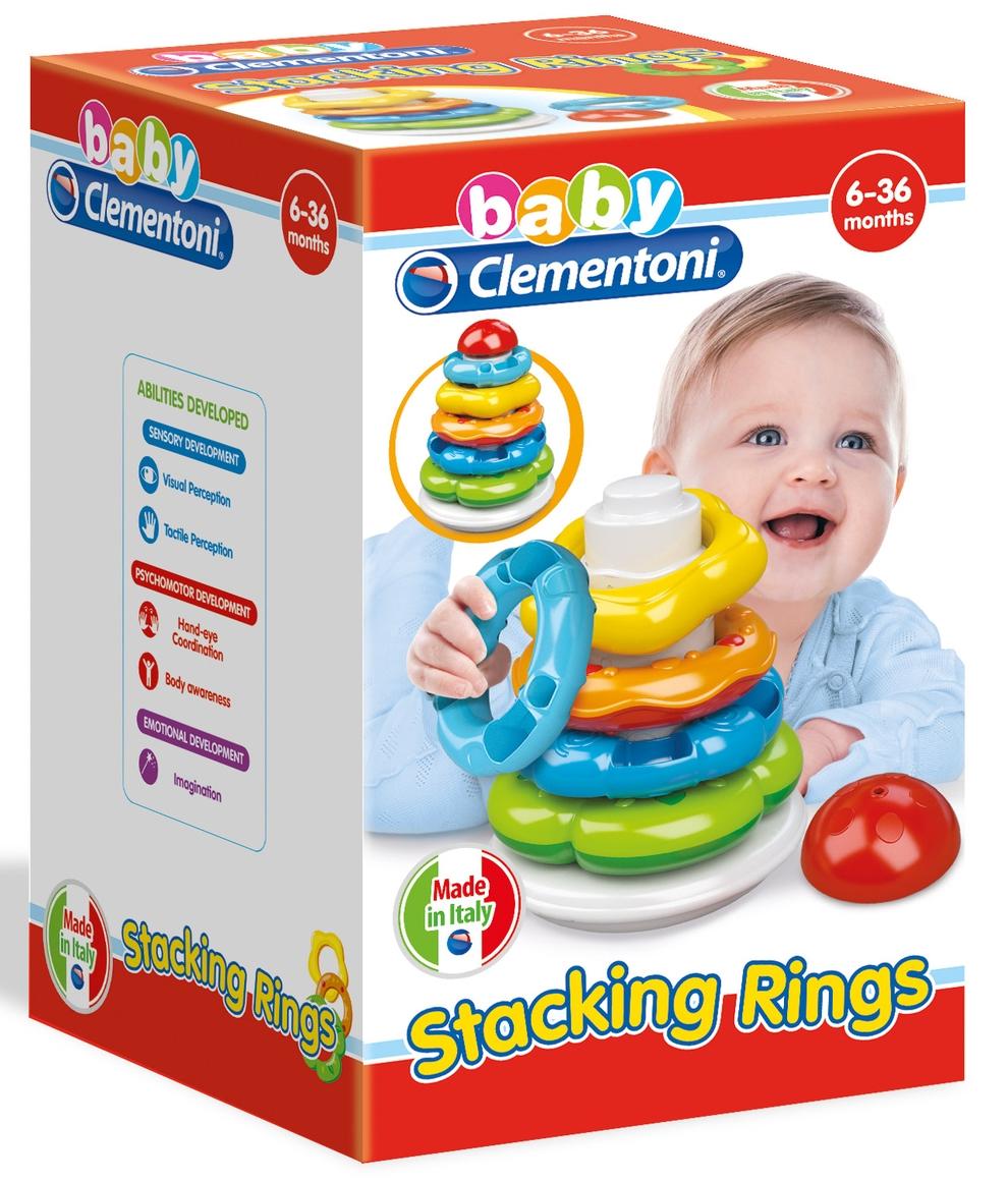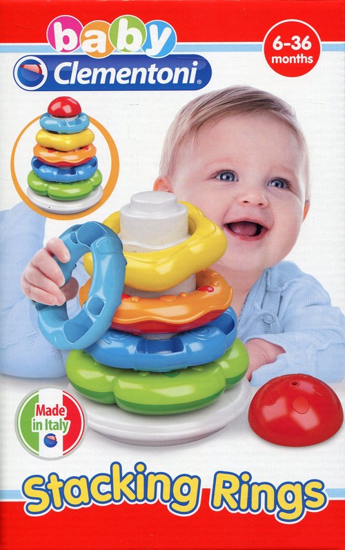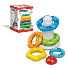 5 kolorowych pierścieni różnych rozmiarów, które można ułożyć w wieżę. Pierścienie wykonane są z różnych powierzchni do stymulacji dotykowej percepcji dzieci od pierwszych miesięcy życia.