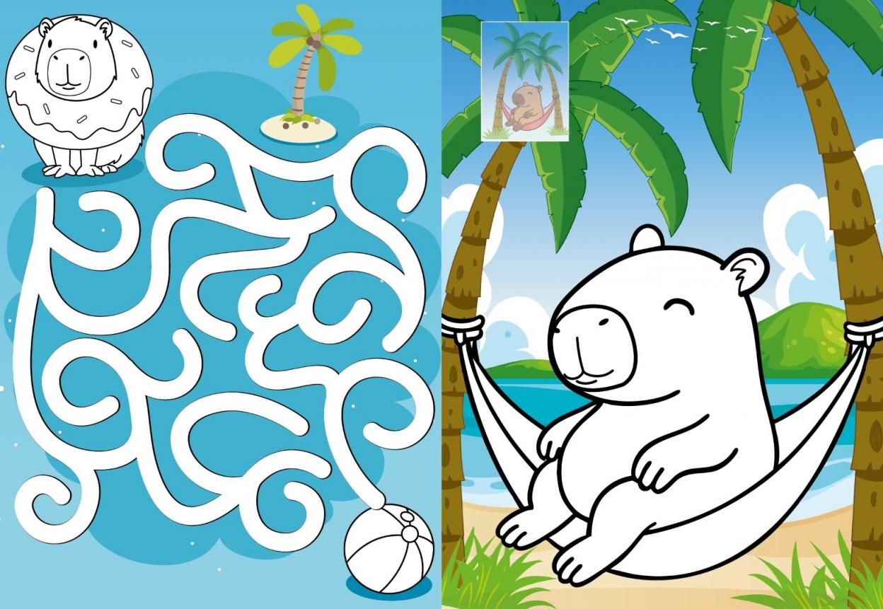 Kolorowanie z naklejkami. Kapibara na wakacjach