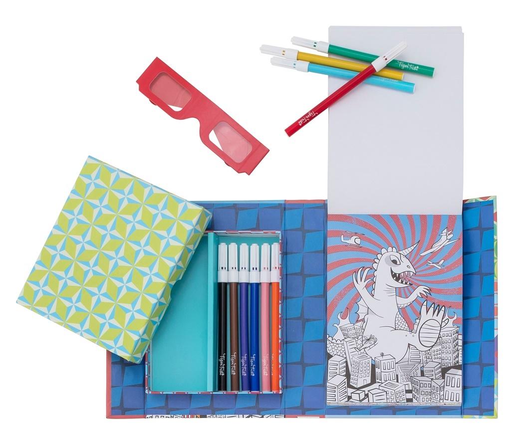 Fantastyczna kolorowanka z okularami 3D będzie doskonałym pomysłem na pokonanie nudy! Dziecko maluje futurystyczne obrazki, a potem ogląda je przez trójwymiarowe okulary. Zestaw zawiera 36 obrazków oraz wysokiej jakości flamastry. Tiger Tribe to marka pełna pomysłowych kreatywnych zestawów idealnych na podróż. Wszystkie pakowane są w solidne pudełka, które nie zajmują dużo miejsca i zwykle są zamykane na magnes. Ich zawartość np. notesiki są trwale przymocowane w środku opakowania, a naklejki, kredki itp. mają swoje miejsce w wewnętrznym pudełeczku.