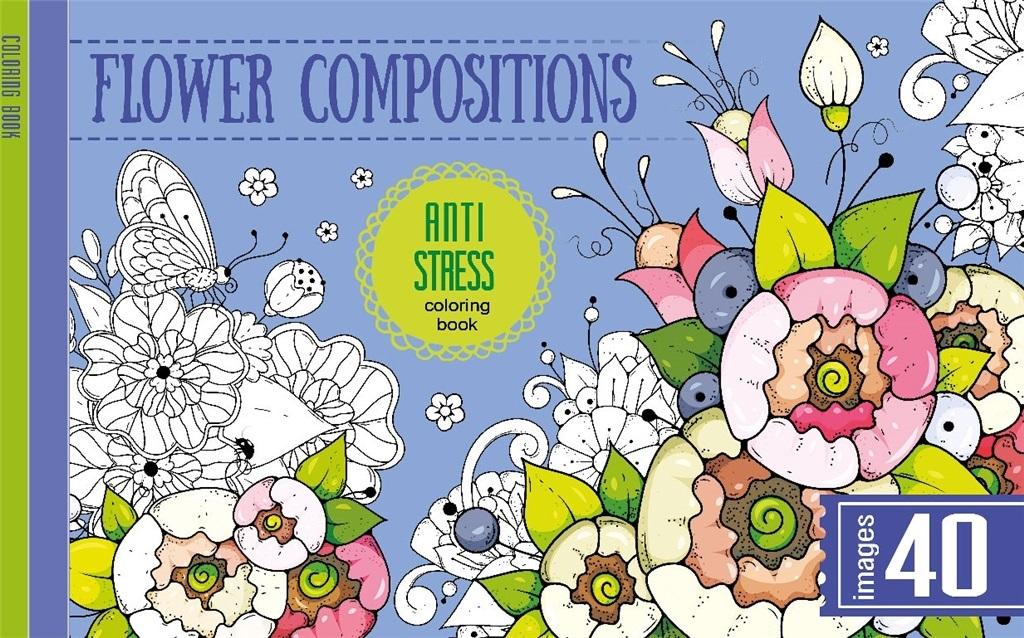 Kolorowanka antystresowa, w środku znajdują się obrazki kwiatowymi kompozycjami. Wyprodukowano na Ukrainie.