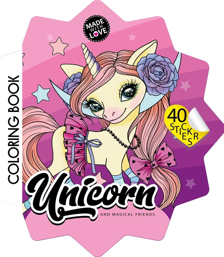 Kolorowanka dla dzieci w kształcie gwiazdki, z magicznymi zwierzątkami. W zestawie 40 naklejek. Wyprodukowano na Ukrainie.