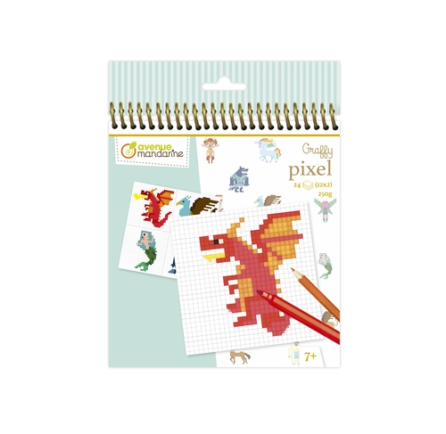 Blok z 24 kolorowymi ilustracjami do odtworzenia na arkuszach w kratkę. Pixel Art, aktywność bardzo ceniona przez dzieci!