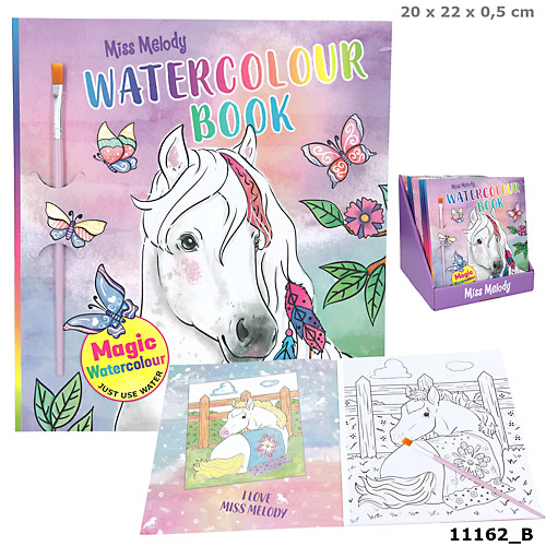 Kolorowanka Miss Melody Water Magic, ok 30 stron do malowania. Do kolorowanki dołączony jest pędzel, mokrym pędzlem trzeba pomalować ciemne linie, by odkryć magię kolorów.