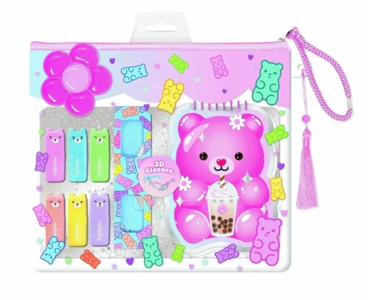Zestaw zawiera: - kolorowanka na spirali z wydrukiem 3D widocznym po założeniu okularów - okulary z efektem 3D - 6 zakreślaczy Zestaw zapakowany w przezroczystą ozdobną saszetkę zamykaną na zamek.
