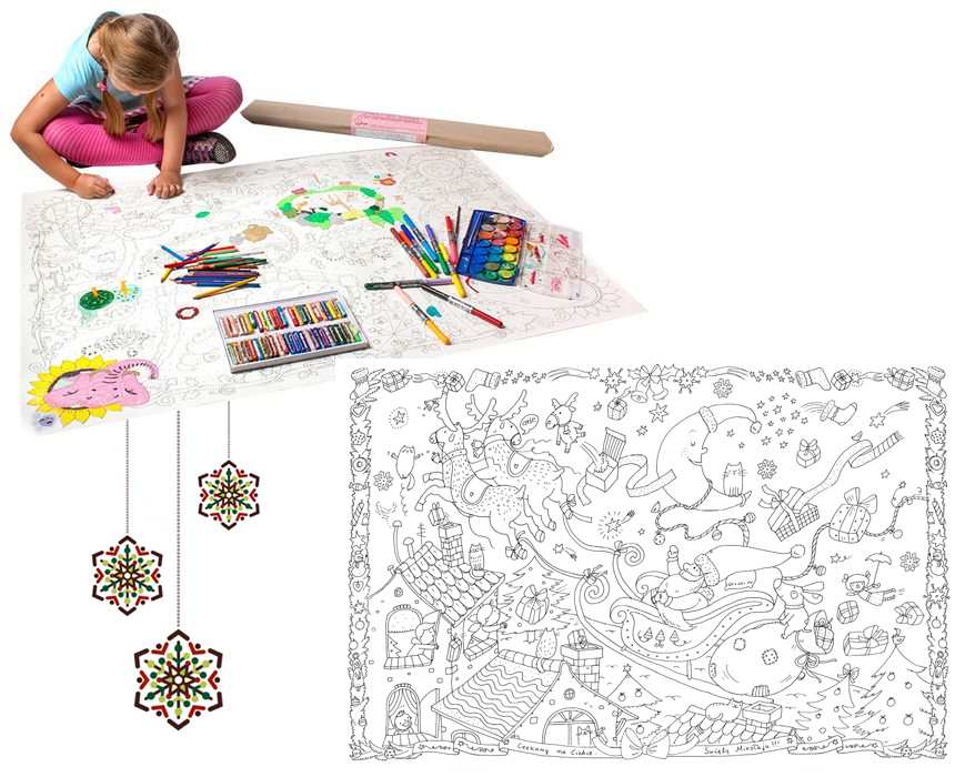 Kolorowanki Podłogowe w rozmiarze XXL o wymiarach 120cm x 80cm - ogromna powierzchnia do kolorowania kredkami, flamastrami i farbami. Wzmocniony spód arkusza zabezpiecza przed przesiąkaniem farb.
