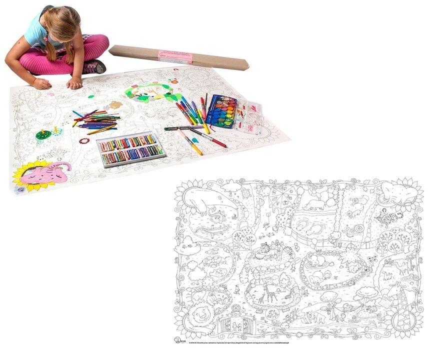 Kolorowanka w rozmiarze 120cm x 80cm. Ogromna powierzchnia do kolorowania kredkami, flamastrami i farbami. Wzmocniony spód arkusza zabezpiecza przed przesiąkaniem farb. Kolorowanka wykonana jest z grubego kartonu, który można bez końca rozkładać i zwijać!