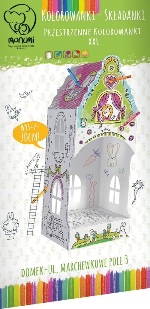 kolorowanka-składanka można kolorować kredkami, flamastrami i farbami po złożeniu ma mocną, stabilną konstrukcję bezpieczne i gwarantuje dłuuugie godziny doskonałej zabawy wzór: ul. Marchewkowe pole
