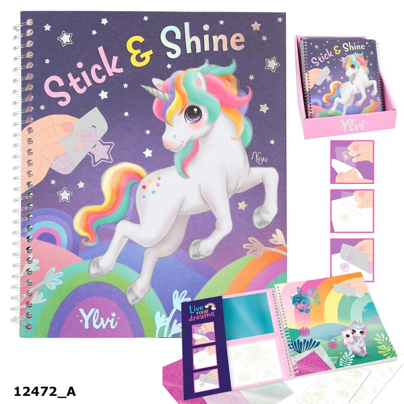 Kolorowanka Stick and Shine Jednorożec Ylvi, z brokatowymi foliami i naklejkami tatuażami.