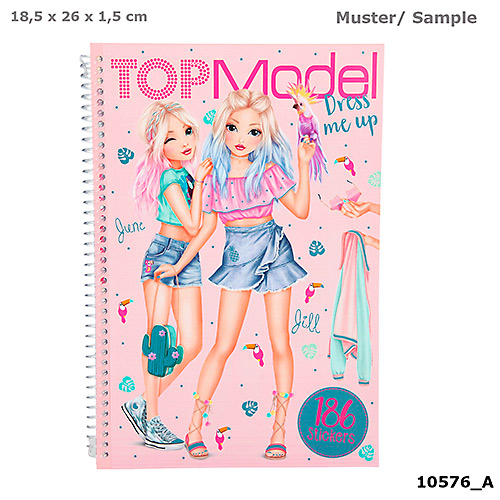 Kolorowanka Dress Me Up Tropical Top Model, w środku 24 strony do kolorowania i naklejania naklejek, 7 stron z naklejkami.