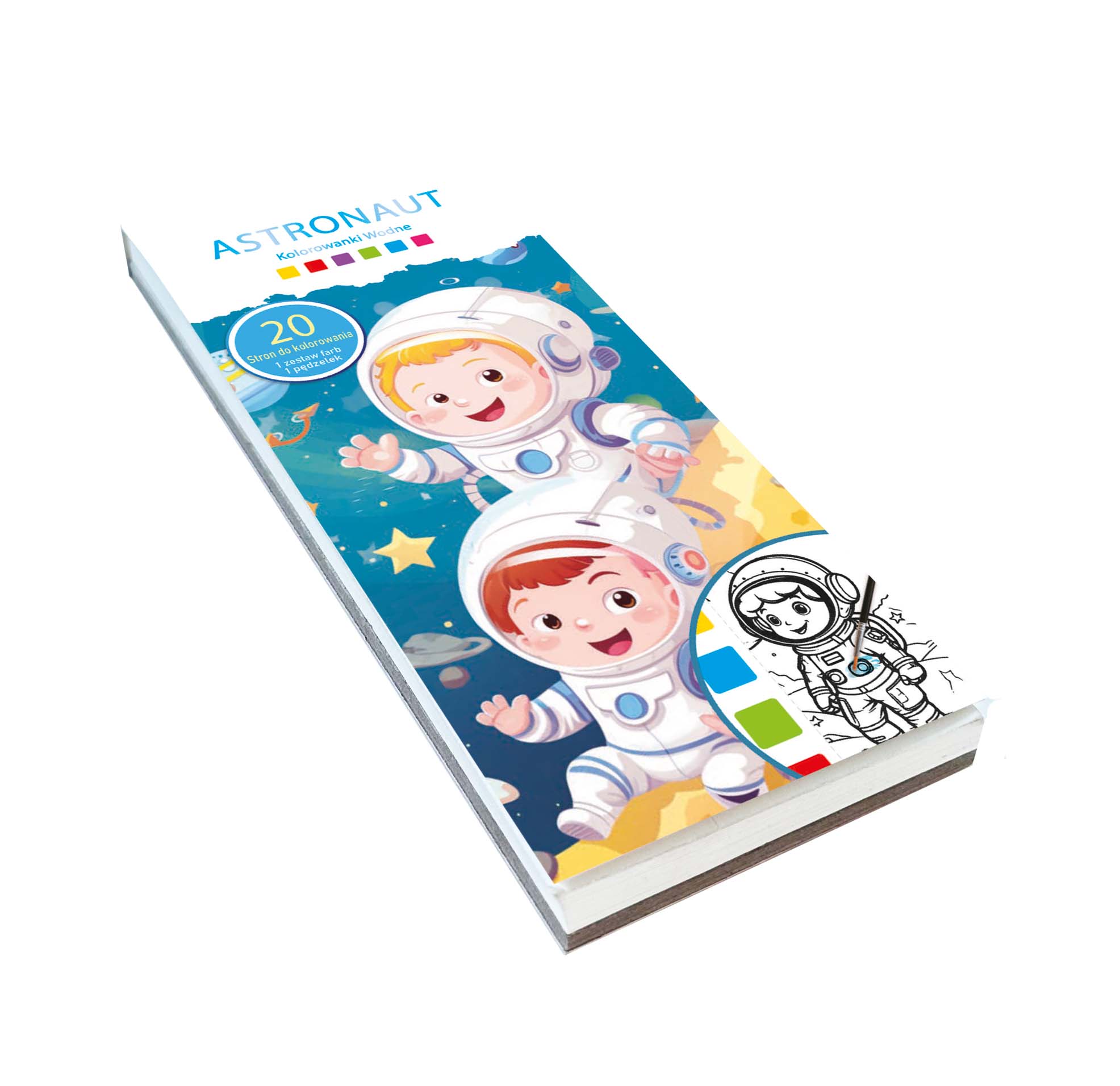 Kolorowanka wodna AUSTRONAUCI, wymiary 8x18,8cm (z opak. 8x23,8cm), 20 stron, w zestawie farby i pędzelek