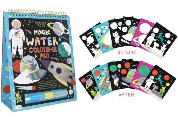 Kolorowanka wodna z pisakiem i podpórką to świetna zabawa dla najmłodszych. Wystarczy napełnić pisak wodą i zachęcić dziecko do kreatywnej zabawy, aby zobaczyć, jak kolory i kształty magicznie się pojawiają, a po wyschnięciu znikają. Dziecko będzie się świetnie bawić, odkrywając kosmitów, planety, spadające gwiazdy i wiele więcej. Sześć zabawnych kart jest połączonych w spiralnie oprawionej okładce, dzięki czemu można je odwracać po ukończeniu. Podpórka wygodnie podtrzymuje karty wielokrotnego użytku. Po zakończeniu zabawy wystarczy złożyć podpórkę, a dzięki elastycznej gumce pisak zawsze będzie na swoim miejscu.