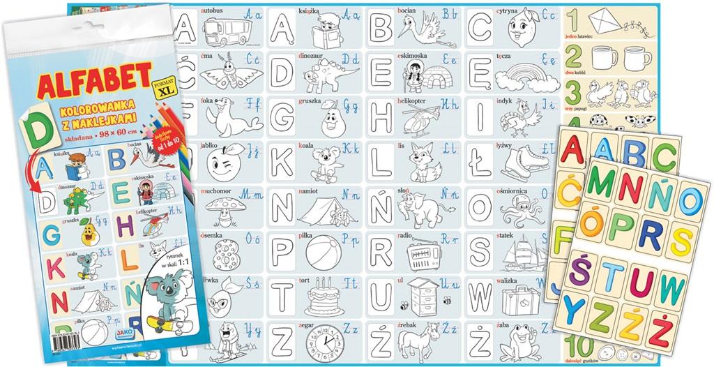 Dzięki składanej kolorowance "Alfabet" dzieci mogą zapoznać się z literami polskiego alfabetu oraz nauczyć się poprawnej kolejności alfabetycznej. Zestaw składa się z arkusza XL oraz 32 naklejek z drukowanymi, wielkimi literami. Naklejki można wkleić w wyznaczonych miejscach, obok obrazków do pokolorowania, których nazwy zaczynają się na daną literę (np. A jak autobus) lub ją zawierają (np. Ę w słowie gęś). Obok obrazków umieszczono także wielkie i małe litery pisane. Poza alfabetem kolorowanka zawiera liczby od 1 do 10 i przypisane do nich w odpowiednich ilościach przedmioty. Kredki w dłoń! Ogromny, ilustrowany arkusz o wymiarach 98 x 60 cm jest do dyspozycji małego artysty. Pokolorowany i uzupełniony naklejkami świetnie się sprawdzi jako edukacyjny plakat na ścianę. Kolorowanie zapewnia doskonałą rozrywkę, a przy tym rozwija zdolności manualne, staranność oraz koordynację wzrokowo-ruchową. To znakomite przygotowanie do szkoły, a także możliwość wyciszenia.