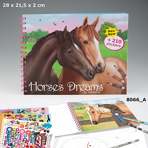 Kolorowanka z konikiem Horses Dreams, ok 100 stron do kolorowania, w środku 4 strony z naklejkami do dekoracji konia.