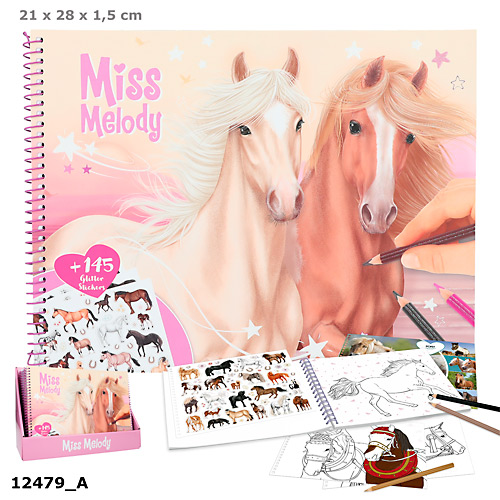 Kolorowanka z naklejkami Miss Melody, od. 44 strony do kolorowania z motywami ze świata koników, do tego 3 strony z naklejkami do ozdabiania stylizacji.