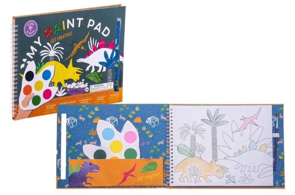 Zestaw kreatywnych kolorowanek z farbkami zawiera 8 wspaniałych obrazków z motywem dinozaurów do pomalowania oraz 8 palet farbek w kształcie łapy dinozaura, a także praktyczny pędzelek. Za pomocą delikatnego pociągnięcia pędzelka nawilżonego niewielką ilością wody i farbki można namalować swój własny obrazek! Palety z farbkami i pędzelek są bezpiecznie przechowywane w spiralnie oprawionej okładce, gdy nie są używane, dzięki czemu kolorowanki idealnie nadają się do malowania w podróży!