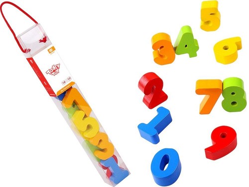 10 drewnianych cyferek to elementy wystarczająco duże, by dziecko mogło wygodnie trzymać je w swoich małych rączkach. Zadaniem dziecka jest nawlekanie ich na dołączone do zestawu sznureczki. Dziecko ćwiczy w ten sposób koncentrację, umiejętności manualne i koordynację ręka – oko. Poznaje także kolory i uczy się liczenia. Zabawki Tooky Toy są bezpieczne. Posiadają certyfikaty ekologicznych produktów. Pozbawione ostrych krawędzi, dobrze wygładzone, pomalowane są nietoksycznymi farbami i lakierami. Wiek: 18 m+