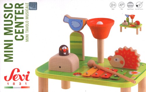 Zestaw czterech instrumentów w jednym: ptaszek, cymbałki, dzwonek, stolik wykonany z drewna Wiek: 2+