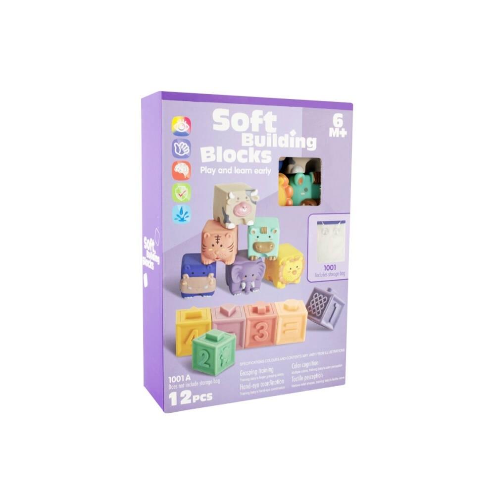 W zestawie znajduje się 12 kwadracików w różne kształty. Kwadraciki posiadają wzór zwierzątek oraz cyfr. Klocki wydają dźwięk podczas ściskania. Dodatkowo zapakowane są w woreczku, który posiada 2 przyssawki.