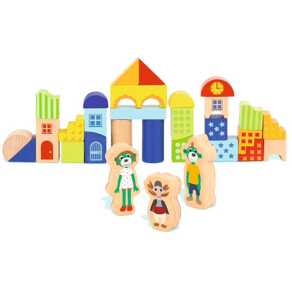 Zestaw kolorowych klocków o różnych kształtach i wymiarach z 3 postaciami z Rodziny Treflików. Wykonany z naturalnego drewna jest doskonałą zabawką ogólnorozwojową, która zachęca do wspólnej zabawy. Wszystkie materiały wykorzystane do stworzenia zabawki posiadają atesty, a także zostały pomalowane nietoksycznymi farbami.