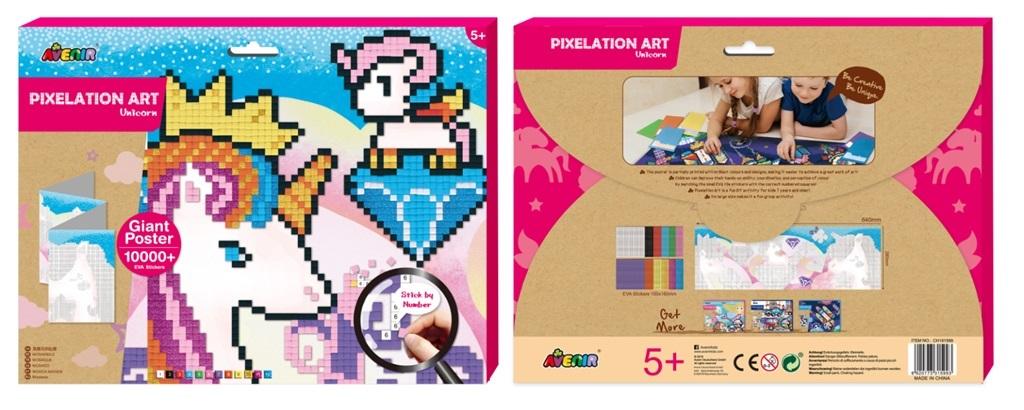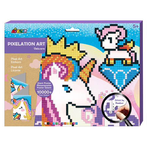 Piksele to nowy wymiar zabawy z Avenir. Do dyspozycji dziecka jest niesamowity gigantyczny plakat wydrukowany w żywych kolorach i z interesującą grafiką z jednorożcem. Zadaniem dziecka jest dopasować małe naklejki do odpowiednich ponumerowanych kwadratów, aby ukończyć pikselową mozaikę. Zabawa wspomaga koordynację ruchową i uczy rozpoznawania liczb oraz cierpliwości. Kolorowy obrazek spodoba się dzieciom, zarówno chłopcom jak i dziewczynkom. W zestawie: - plakat (wymiary: 84 x 29 cm) - 800 naklejek z pianki EVA Wiek7+