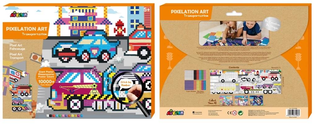 Piksele to nowy wymiar zabawy z Avenir. Do dyspozycji dziecka jest niesamowity gigantyczny plakat wydrukowany w żywych kolorach i z interesującą grafiką pojazdów miejskich. Zadaniem dziecka jest dopasować małe naklejki do odpowiednich ponumerowanych kwadratów, aby ukończyć pikselową mozaikę. Zabawa wspomaga koordynację ruchową i uczy rozpoznawania liczb oraz cierpliwości. Kolorowy obrazek spodoba się dzieciom, zarówno chłopcom jak i dziewczynkom. W zestawie: - plakat (wymiary: 84 x 29 cm) - 800 naklejek z pianki EVA
