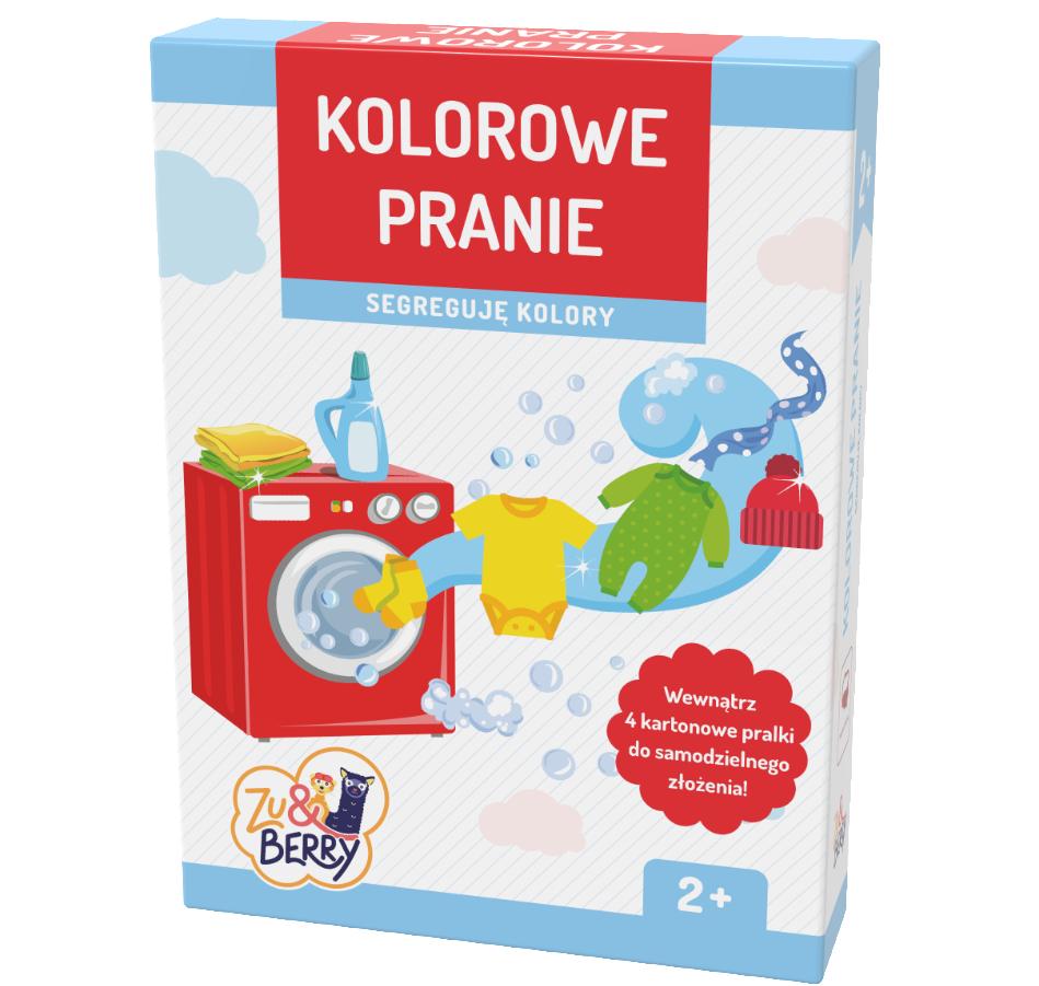 Sortowanie kolorów dla najmłodszych. Zestaw zawiera 4 różnokolorowe kartonowe pralki do samodzielnego złożenia oraz 16 żetonów przedstawiających ubrania w kolorach odpowiadających im pralek. Gracze wkładają żetony do pralki tego samego koloru. Mogą też segregować ubranka pod kątem pory roku czy rodzaju. Gra uczy nie tylko rozróżniania kolorów i elementów odzieży, ale i zachęca dziecko do pomagania w pracach domowych. Polecane przez psychologów dla dzieci od 2. roku życia.