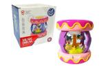 Interaktywny bębenek muzyczny z Karuzelką Różowy Interaktywny, muzyczny bębenek sprawi frajdę każdemu maluchowi, którego już teraz pasjonuje muzyka i przyjemne dźwięki. Bawiąc się tym produktem, samo będzie decydować, co zaraz usłyszy. Uderzając w bębenek, młody muzyk przeniesie się w świat melodii, płynących z tych dźwięcznych instrumentów. Muzyczna zabawka nie tylko zachęci malucha do psot, ale pozytywnie wpłynie na rozwój i edukację dziecka. Wspólne zabawy z wykorzystaniem przedstawionego bębenka zachęcą dziecko do aktywności, a także zaangażują wiele zmysłów, wpływając równocześnie na jego emocje. Bębenek wyposażony jest w jeden duży przycisk znajdujący na samym środku uruchamiający funkcję bębenka. Wkoło rozmieszczone są dotykowe przyciski odpowiadające za różne dźwięki i melodie. Dotykając nutkę usłyszymy wesołą muzyczkę, natomiast przyciski, na których widnieją dziecinne akcesoria takie jak śpiochy, wózek, butelka czy śliniak odpowiadają za odgłosy zwierząt i inne wesołe dźwięki. Różowy przycisk z trójkącikiem służy nam do wyboru wariantów muzycznych na przyciskach. Zabawka posiada regulację głośności oraz efekty świetlne. Dodatkowym atutem skupiającym uwagę dziecka jest znajdująca się w środku bębenka karuzela z kucykami. Zaopatrzenie dziecka w zabawkowy instrument, znakomicie sprawdzi się podczas ćwiczeń małych paluszków, a także koordynacji wzrokowo-manualnej, co w przyszłości ułatwi naukę pisania, a także rozwinie logiczne myślenie. Uruchomienie wszystkich funkcji zabawki wymaga użycia 3 sztuk baterii AA, które nie zostały dołączone do zestawu. Wymiary bębenka: 11,5 cm x 10,5 cm x 10,5 cm Wymiary Opakowania: 14cm x 11 cm x 13,5 cm