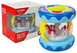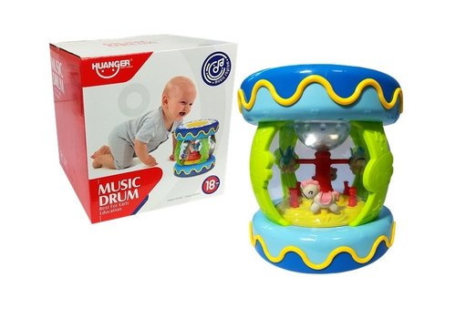 Interaktywny bębenek muzyczny z Karuzelką Niebieski Interaktywny, muzyczny bębenek sprawi frajdę każdemu maluchowi, którego już teraz pasjonuje muzyka i przyjemne dźwięki. Bawiąc się tym produktem, samo będzie decydować, co zaraz usłyszy. Uderzając w bębenek, młody muzyk przeniesie się w świat melodii, płynących z tych dźwięcznych instrumentów. Muzyczna zabawka nie tylko zachęci malucha do psot, ale pozytywnie wpłynie na rozwój i edukację dziecka. Wspólne zabawy z wykorzystaniem przedstawionego bębenka zachęcą dziecko do aktywności, a także zaangażują wiele zmysłów, wpływając równocześnie na jego emocje. Bębenek wyposażony jest w jeden duży przycisk znajdujący na samym środku uruchamiający funkcję bębenka. Wkoło rozmieszczone są dotykowe przyciski odpowiadające za różne dźwięki i melodie. Dotykając nutkę usłyszymy wesołą muzyczkę, natomiast przyciski, na których widnieją dziecinne akcesoria takie jak śpiochy, wózek, butelka czy śliniak odpowiadają za odgłosy zwierząt i inne wesołe dźwięki. Różowy przycisk z trójkącikiem służy nam do wyboru wariantów muzycznych na przyciskach. Zabawka posiada regulację głośności oraz efekty świetlne. Dodatkowym atutem skupiającym uwagę dziecka jest znajdująca się w środku bębenka karuzela z kucykami. Zaopatrzenie dziecka w zabawkowy instrument, znakomicie sprawdzi się podczas ćwiczeń małych paluszków, a także koordynacji wzrokowo-manualnej, co w przyszłości ułatwi naukę pisania, a także rozwinie logiczne myślenie. Uruchomienie wszystkich funkcji zabawki wymaga użycia 3 sztuk baterii AA, które nie zostały dołączone do zestawu. Wymiary bębenka: 11,5 cm x 10,5 cm x 10,5 cm Wymiary Opakowania: 14 cm x 11 cm x 13,5 cm