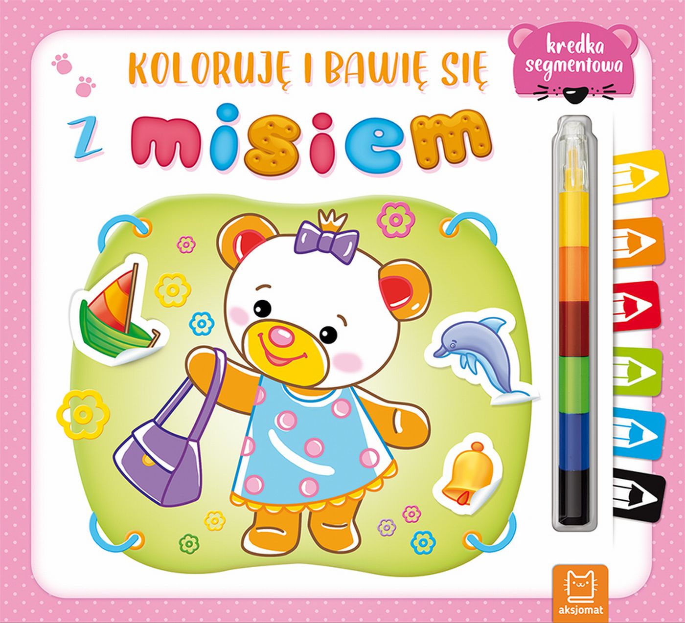 znajdzie w niej segmentową miękką kredkę oraz okrągłe naklejki w podstawowych barwach, które będą doskonałą pomocą w nauce kolorów.