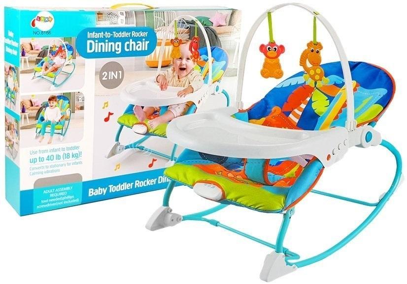 Kołyska Bujaczek Fotelik Krzesełko do Karmienia 2 w 1 Niebieski Wygodny fotelik, w którym maluszek może odpoczywać i oddawać się zabawie, jest bardzo istotny podczas kompletowania wyprawki dla niemowlaka. Prezentujemy niebiesko- zielony bujaczek ozdobiony motywem z dinozaurami, który z pewnością sprawi ogromną przyjemność każdemu maluchowi. Zaprojektowano go z myślą o noworodkach i starszych maluchach. Mogą z niego korzystać dzieci do 3 roku życia. Maksymalne obciążenie to aż 18 kg. Leżaczek dzięki intuicyjnej obsłudze, a przede wszystkim prostej konstrukcji, może być używany na różne sposoby. Z powodzeniem wykorzystasz go jako bujaczek dla maluszka, a także jako klasyczny fotelik do karmienia, który rozłożysz w każdych warunkach. Wielofunkcyjność siedziska dla malucha sprawia, że możecie zabrać go ze sobą wszędzie, a w zależności od sytuacji zmienić jego zastosowanie. Ten fotelik rośnie razem z dzieckiem ! Gdy dziecko urośnie, wystarczy usunąć pasy zabezpieczające. Posiada następujące funkcje: -siedzisko odchylane w 4 pozycjach - możliwość prania tkaniny w pralce - stolik do jedzenia - uspokajające wibracje, ułatwiające zasypianie - głębokie siedzisko - 3- punktowy pas zabezpieczający - wyjmowany okrąg z zabawkami Dodatkowo do zestawu dołączony jest miś i żyrafa do zawieszenia. Z pewnością przyciągną uwagę dziecka, zachęcając do treningu rączek. Bujak może pobudzić lub ukoić zmysły dziecka, dzięki wibracji. Wymiary krzesełka: 72 cm x 49 cm x 35 cm Wymiary siedziska: długość- 70 cm szerokość-40 cm głębokość siedziska-10 cm Wymiary wiszących zabawki: około 12 cm x 9 cm Wysokość okręgu od bujaczka: około 30 cm Długość okręgu: 86,5 cm Wymiary stolika do jedzenia: 41 cm x 36 cm Wymiary opakowania: 58 cm x 44 cm x 10,5 cm Bujaczek zasilany jest 2 sztukami baterii AA 1,5V, które nie są dołączone do zestawu. Przeznaczony dla dzieci od pierwszych dni życia. Zgodny z normą EN71. Zabawka wykonana jest z certyfikowanego materiału, jakim jest wytrzymały na częste użytkowanie plastik.