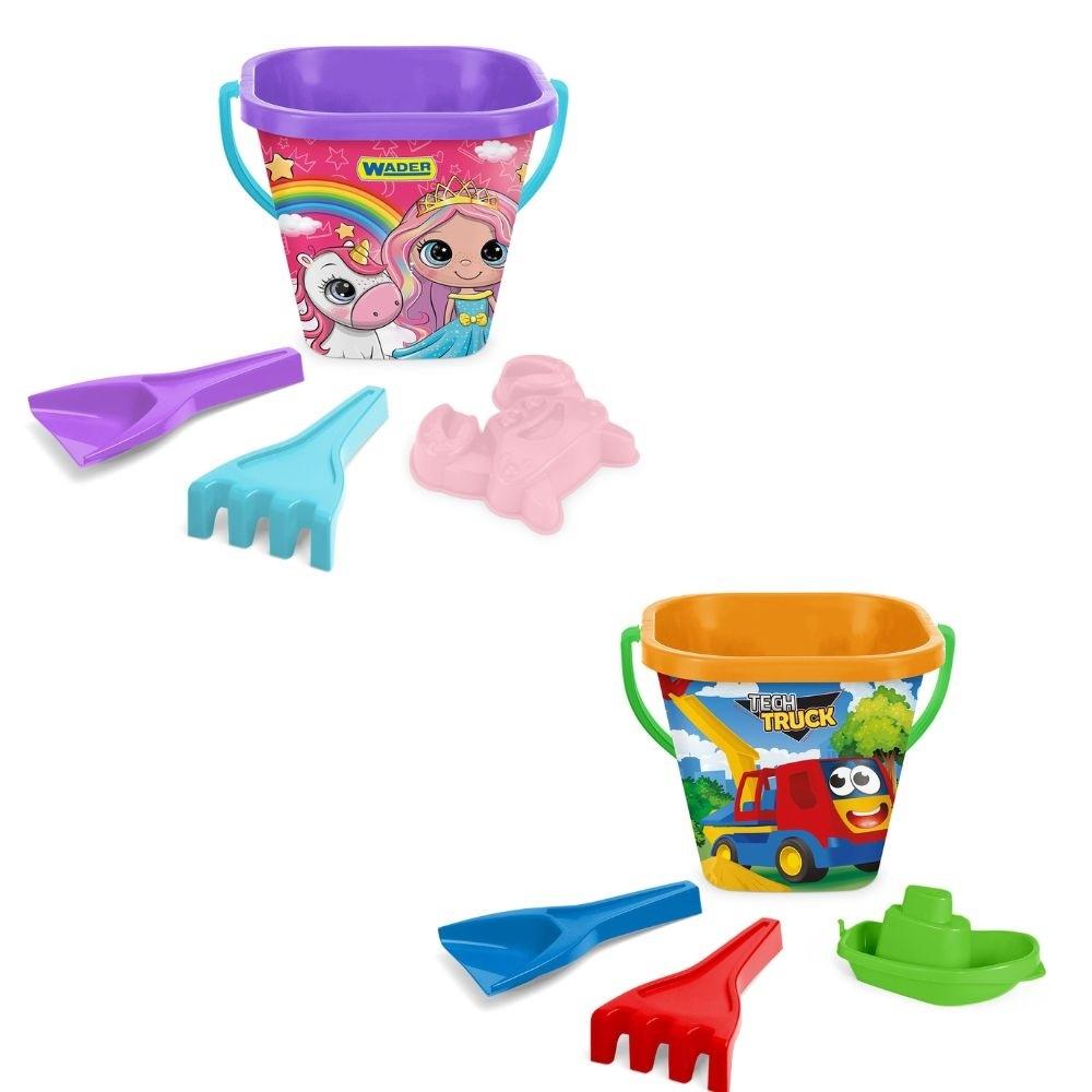 W skład zestawu wchodzi wiaderko, łopatka i grabki oraz foremka.
