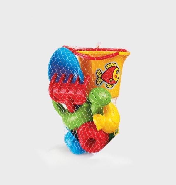 Komplet do piasku zawiera: wiaderko, sitko, konewkę, grabki, łopatkę oraz 3 foremki. Mix kolorów, towar wysyłany losowo.