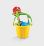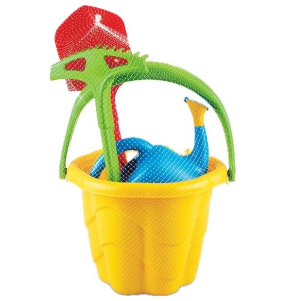 W zestawie 4 elementy: wiaderko, łopatka, grabki, konewka