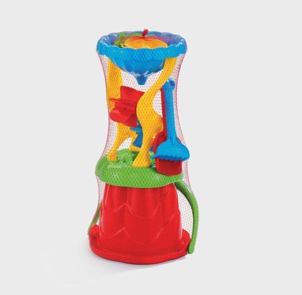 Zestaw do piaskownicy zawiera: młynek, wiaderko, łopatkę, grabki oraz 3 foremki. Mix kolorów, towar wysyłany losowo.