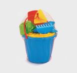 W zestawie: 8 elementów: wiaderko, sitko, łopatka, grabki, żaglówka, 3x foremki