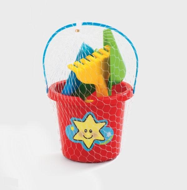 W zestawie 6 elementów: wiaderko, grabki, łopatka, 3x foremki