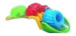 Zawiera łopatkę, grabki i trzy foremki. Całość spakowana jest w siatkę. Wymiary ok. 26 cm x 11 cm x 7,5 cm