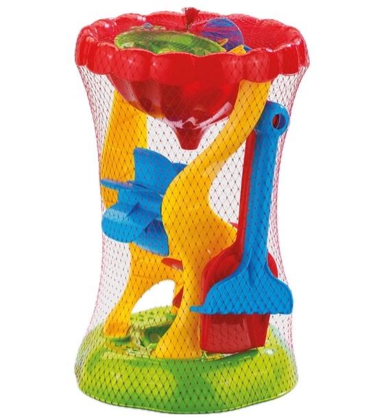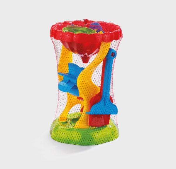 W zestawie 6 elementów: młynek, łopatka, grabki, 3 foremki